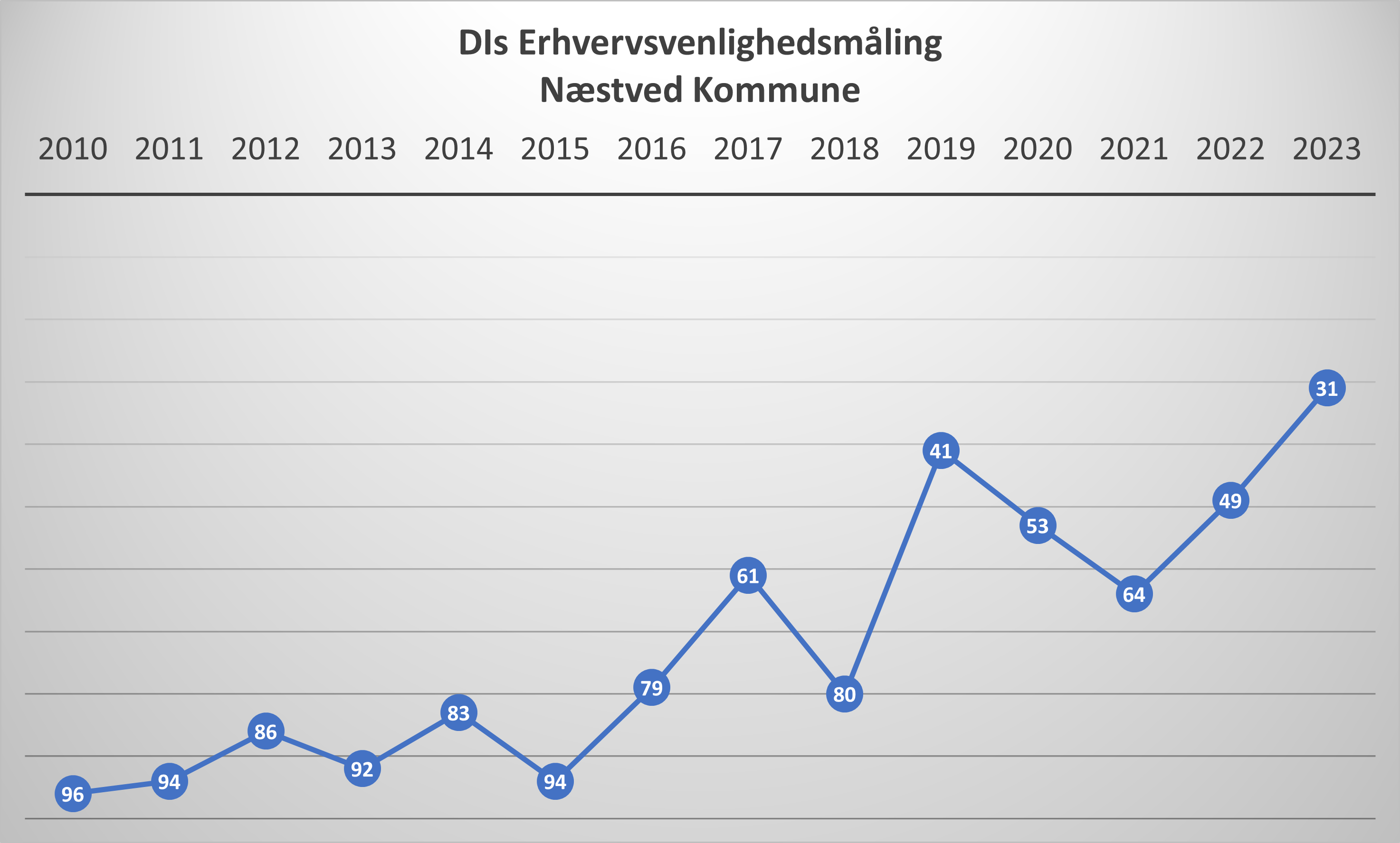 En plads som nummer 31 i Danmark er Næstved Kommunes hidtil bedste placering i undersøgelsens historie. Næstved Kommune får de bedste vurderinger på parametrene ”Skatter, gebyrer og erhvervsarealer”, ”Digitale rammer”, ”Sagsbehandling” samt ”Information & dialog”. Der, hvor undersøgelsen giver kommunen den dårligste karakter, er på ” Adgangen til kvalificeret arbejdskraft”.